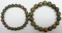 ユナカイトとは主成分が緑簾石(エピドート:緑色部分)で構成されており、その他に長石(フェルドスパー:ピンクまたは朱色部分)、石英(クォーツ:白透明色部分)、緑泥石(クローライト:濃緑色または黒色部分)などの鉱物が集合してできた天然岩石を指します。ビーズによって多様な色合いを見せてくれる面白い鉱物です。当ブレスレットはユナカイト原石をそのままビーズに加工して仕立てた一品です。