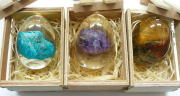 天然のアフリカ産クリソコーラ原石(珪孔雀石)、アメシスト原石(紫水晶)、タイガーアイ原石(虎目石)をそれぞれそのまま透明硬化樹脂に閉じ込めた鉱物標本や置物、プレゼント用に最適な一品です。木箱と透明樹脂製台座もセットでお買い得です。日昇堂オリジナル考案の一品ですので日昇堂でしか手に入らないアイデア珍品といえます。写真画像真ん中アメシストは拡大写真画像ご参照ください(単品を撮影したものが在庫ございます。)。