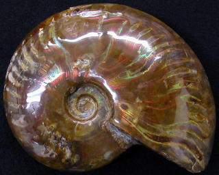アンモライトとは約2億5千万年前から6千5百万年前(中生代)に生息していたアンモン貝(アンモナイト)が化石化し、その表面に霰石[CaCO3(天然炭酸カルシウム)/モース硬度3.5〜4.0/比重2.95/屈折率1.530〜1.685]が薄く(約1〜2mm程度)付着して、虹色(イリデッセンス効果)の閃光を発するオパールの様な輝く宝石鉱物とされます。産地はカナダアルバータ州南部レスブリッジ周辺やマダガスカルで採掘されますが、多くはカナダで産出されるものとなっています。世界で初めて発見したのはブラックフットインディアンとされ、これを持つものに「強力なパワーと幸福を招く」とされ、神秘的なものとして古来より用いられ、現在も貴重な希少鉱物として市場で取引されています。また、先住民においては陰の気(消極的エネルギー)を除去する働きがあるとされ用いられていました。閃光色は赤色/オレンジ色/黄色(金色)/緑色/黄緑色が多く、青色や紫色は非常に少なくなっています。アンモライトは非常にもろいため、取り扱いには注意が必要です。一般的な加工物は合成樹脂やプラスティックなどで硬度を補って、(硬度約6〜8程度)ペンダントなどで用いられています。アンモライト自体を超音波洗浄、酸性液洗浄、漂白洗浄等で洗うことは禁物とされます。また、採掘量が限られているため、非常に希少で貴重な珍品といえます。