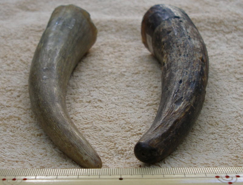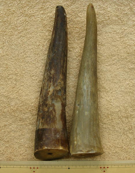 表面が濃色のオランダ水牛角は一部表面の皮が取れている箇所がございますが、内部はオランダ水牛特有の灰白透明色が拡大写真画像でも見受けられますとおり、詰まっております。